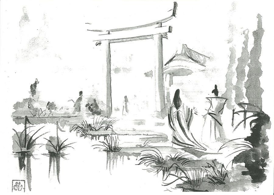 ![Храм Хигаси Хонгандзи Япония рисунок карандашом]()