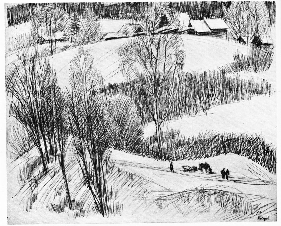 Зимний сельский пейзаж Графика