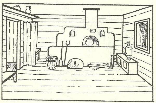 ![Русская изба внутри рисунок с печкой]()