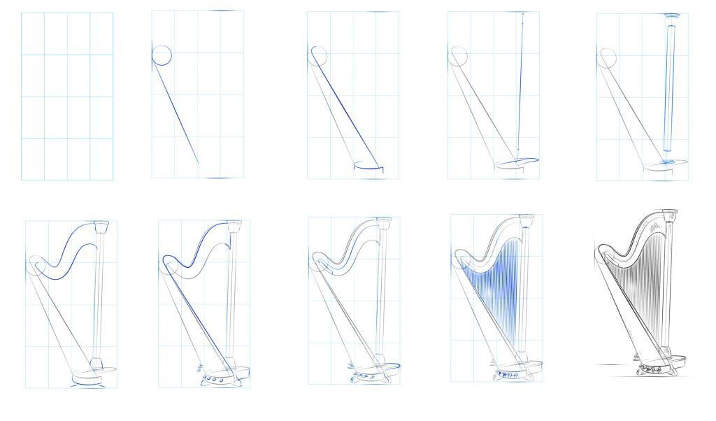 Поэтапное рисование арфа для детей