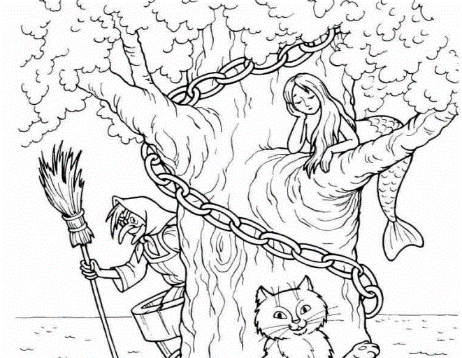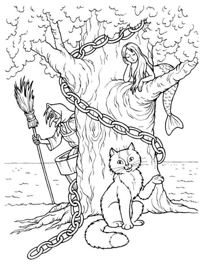 Раскраски по сказке у Лукоморья дуб зеленый Пушкина для детей
