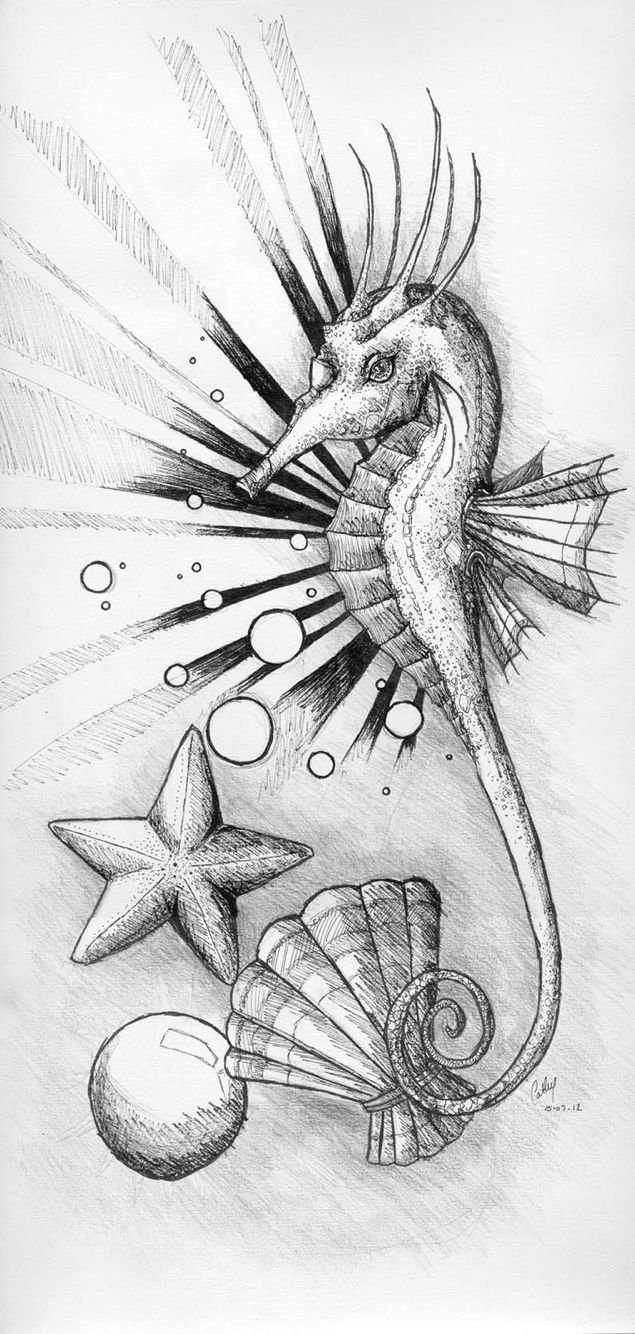 ![Морской конёк рисунок карандашом]()