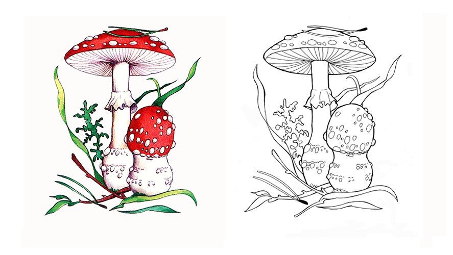 ![Раскраска белый гриб и мухомор]()