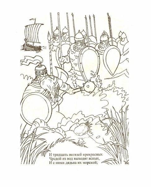 ![Раскраска Пушкин сказка о царе Салтане 33 богатыря]()