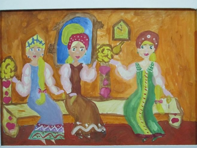 ![Иллюстрации к сказке о царе Салтане три девицы под окном]()