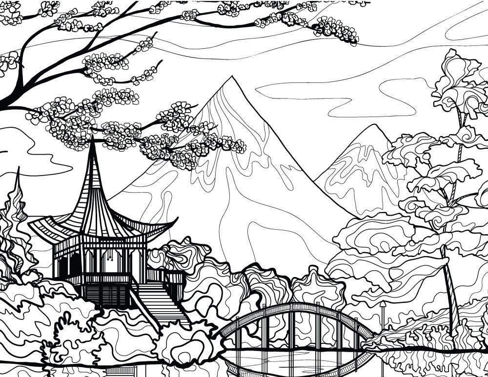 Японский пейзаж раскраска для детей