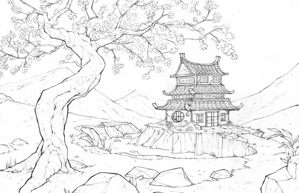 Пейзаж Японии карандашом