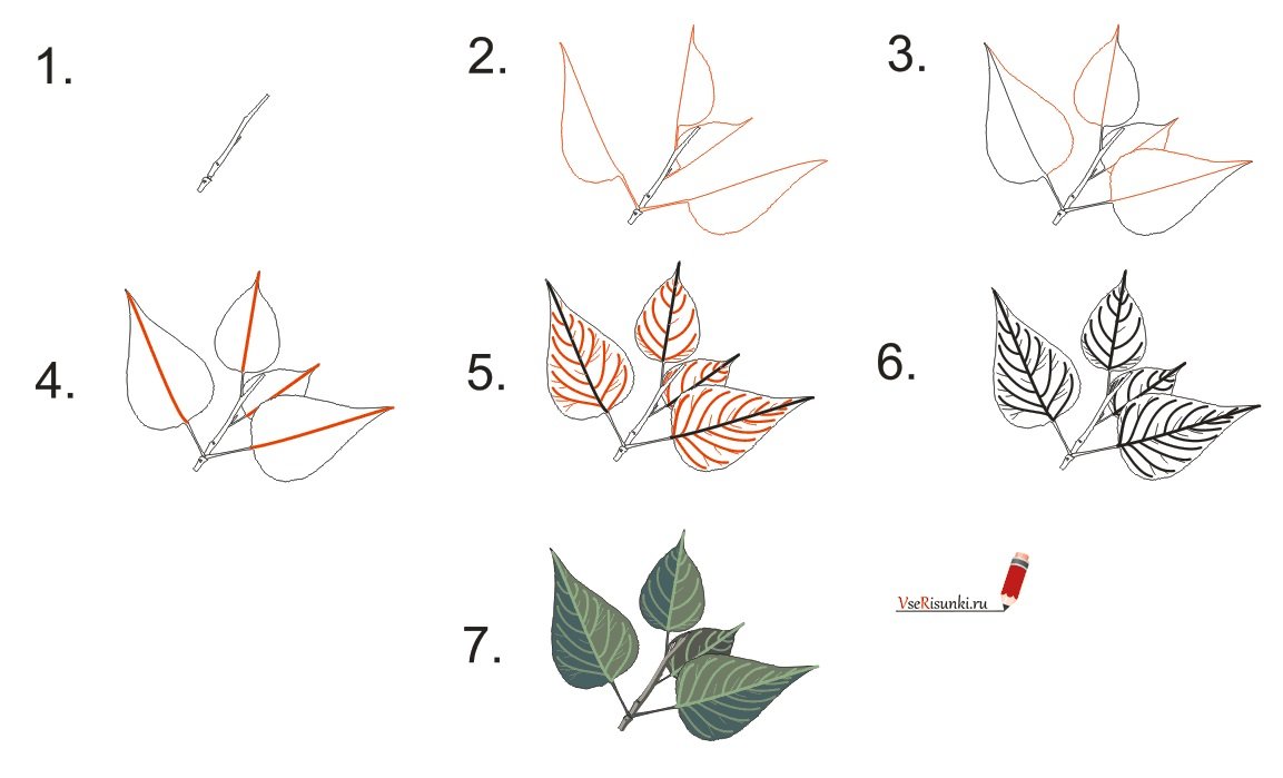 Поэтапное рисование ветки с листьями