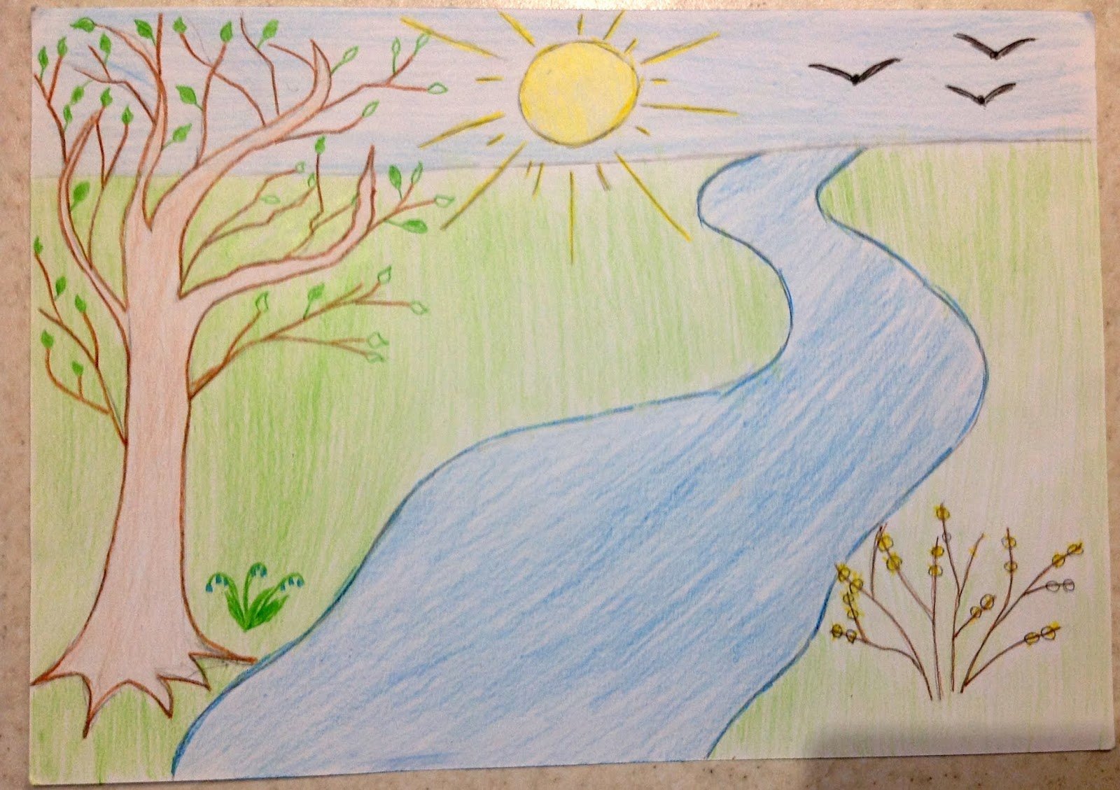 Весенний пейзаж цветными карандашами