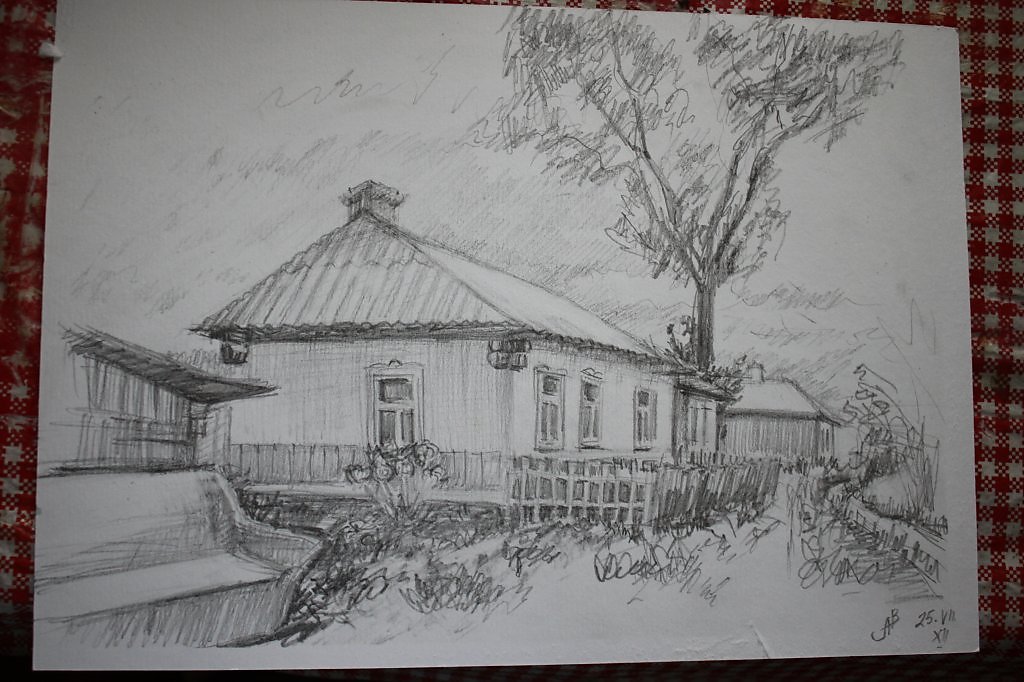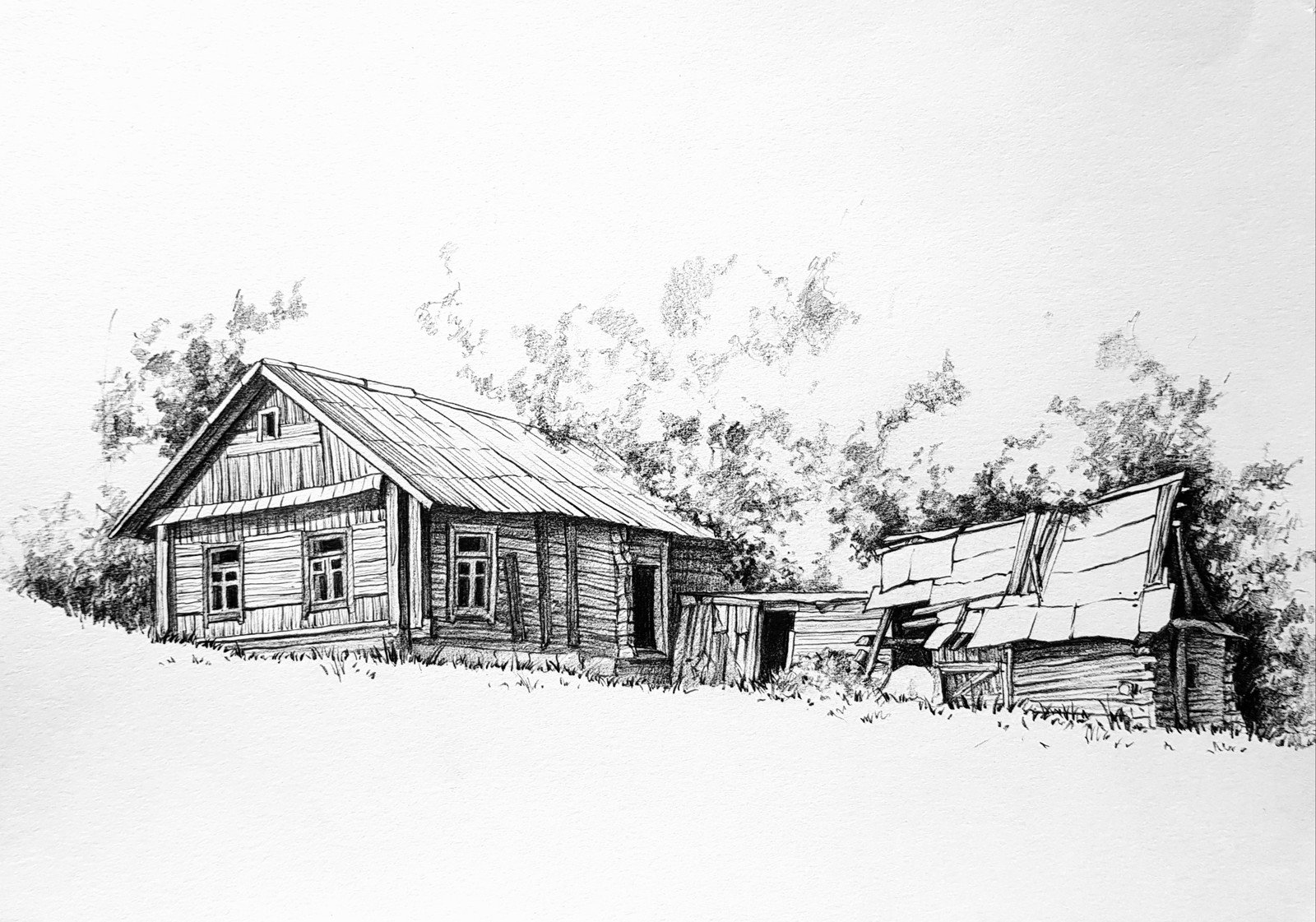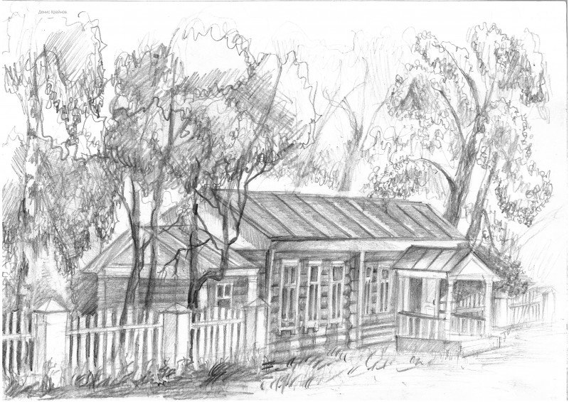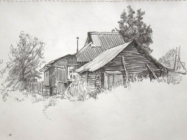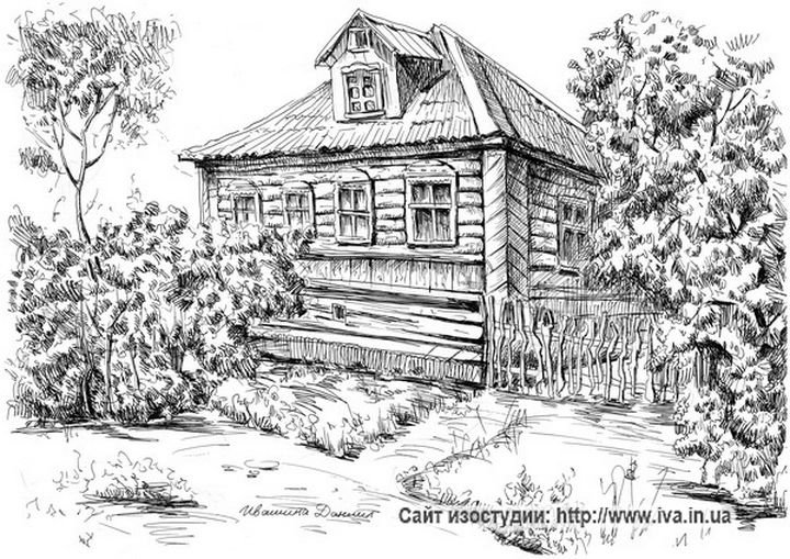 ![Деревенский домик карандашом]()