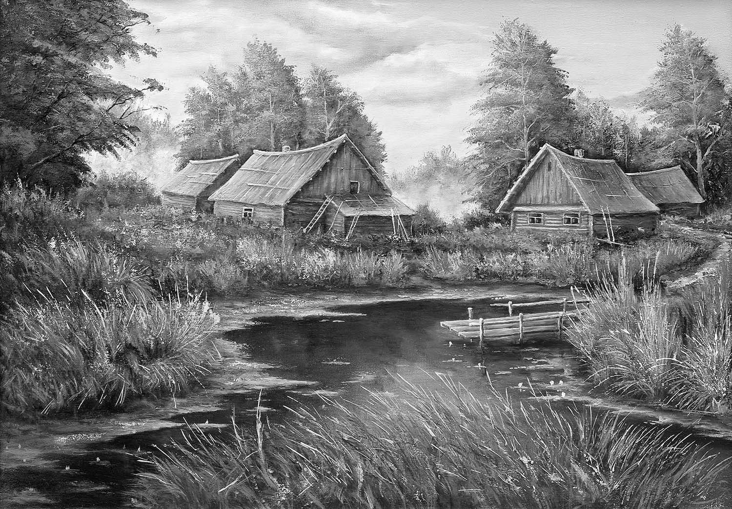 Деревенский пейзаж гризайль