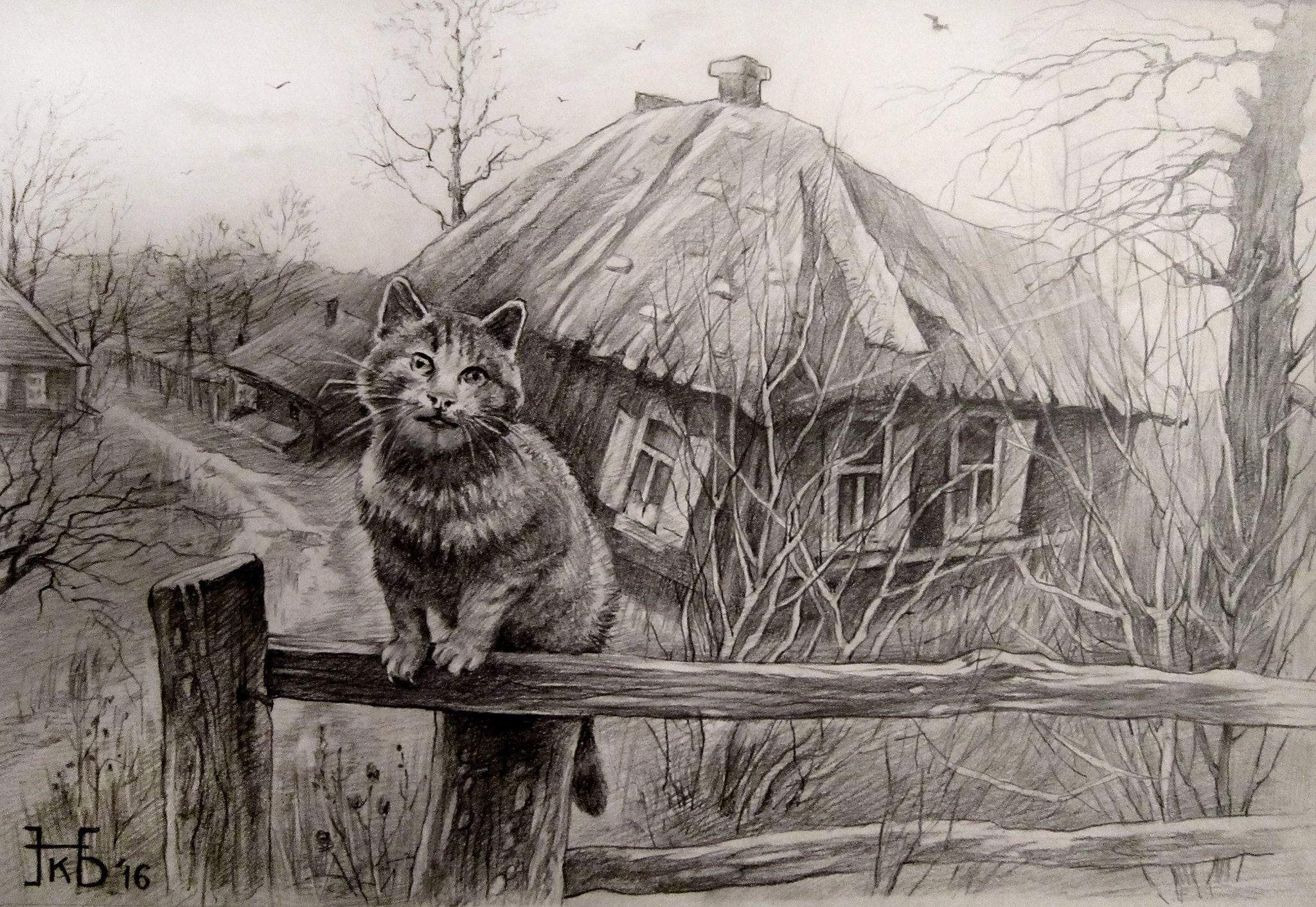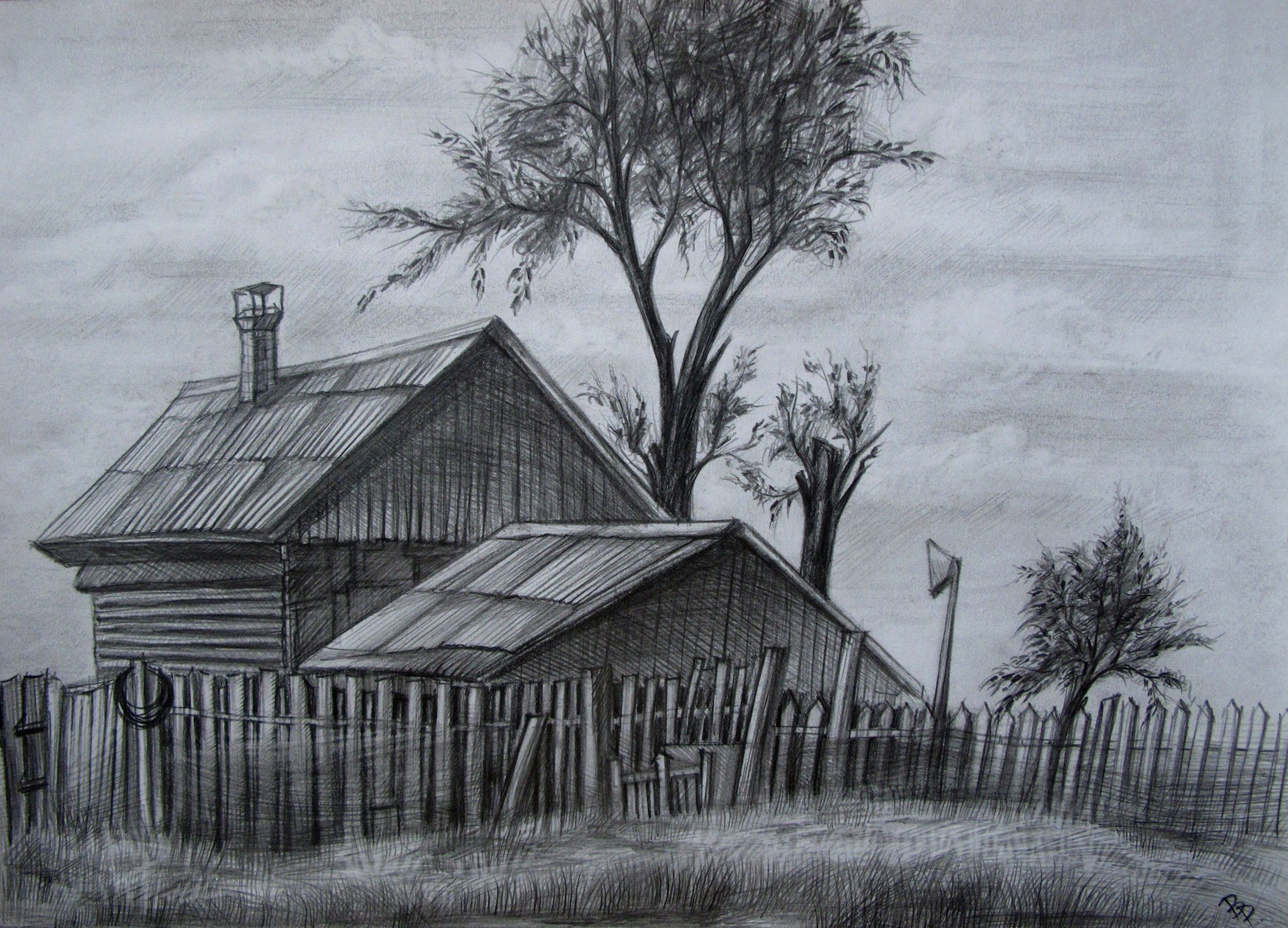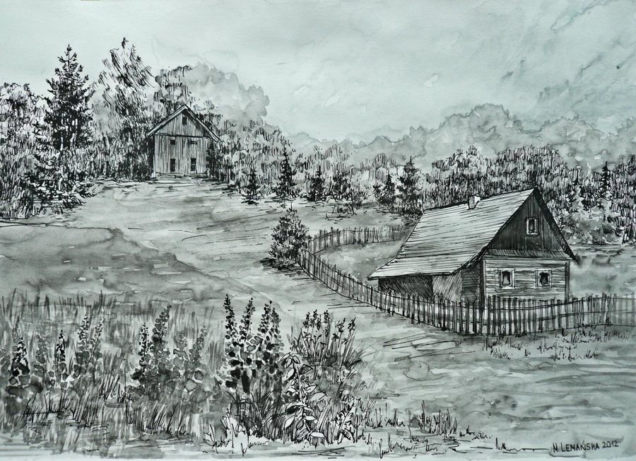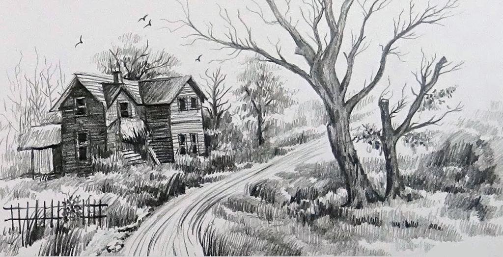 ![Деревенский пейзаж карандашом]()