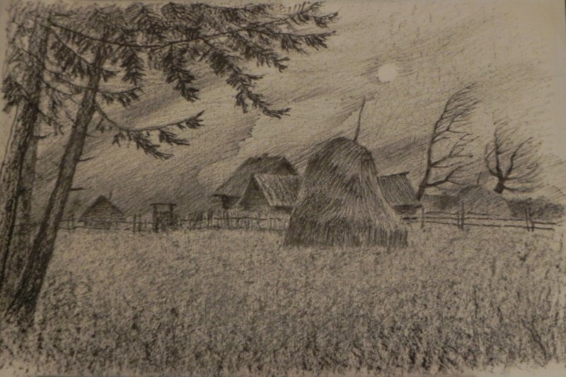 Деревенский пейзаж углем