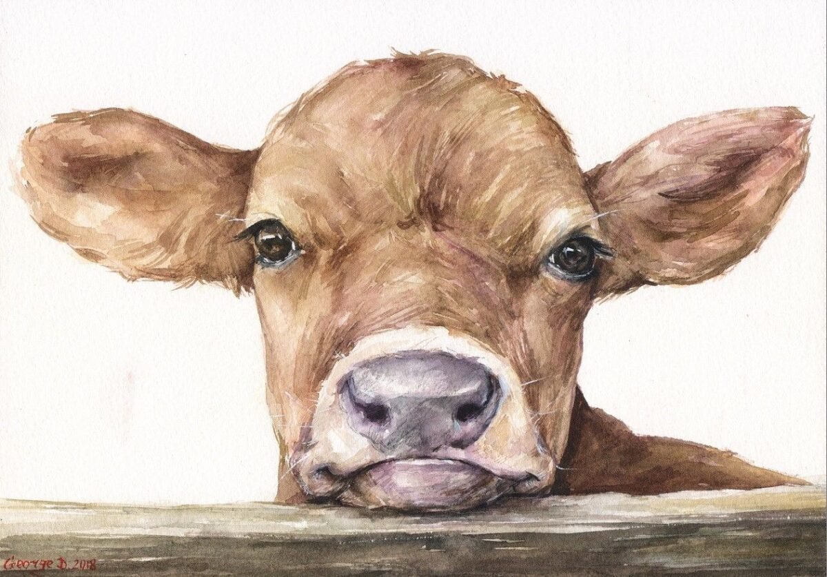 Теленок акварель