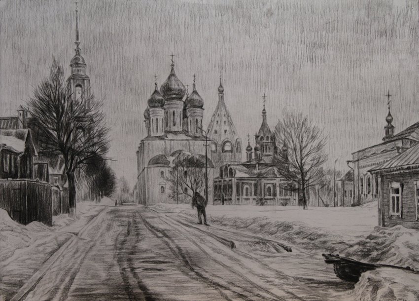 ![Рисунки набережной реки Волги Кострома]()