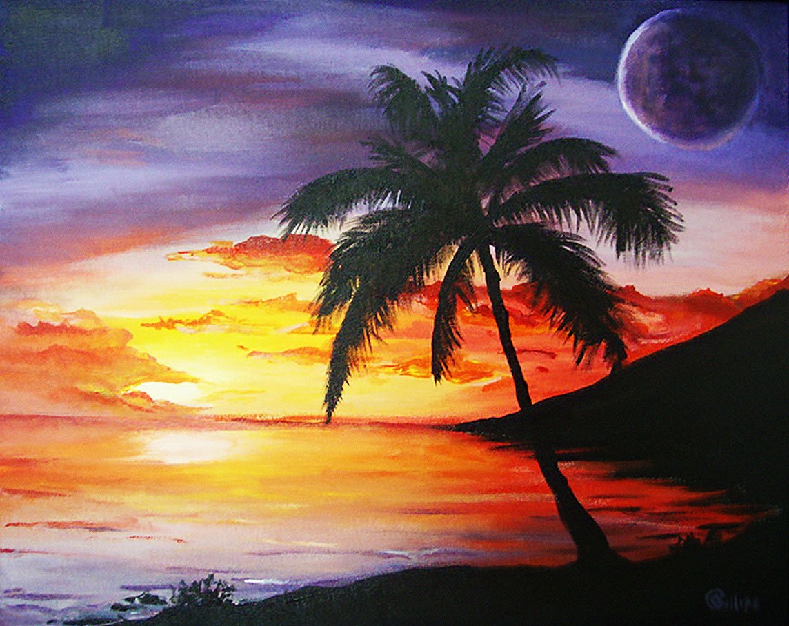 ![Пейзаж с пальмой красками]()