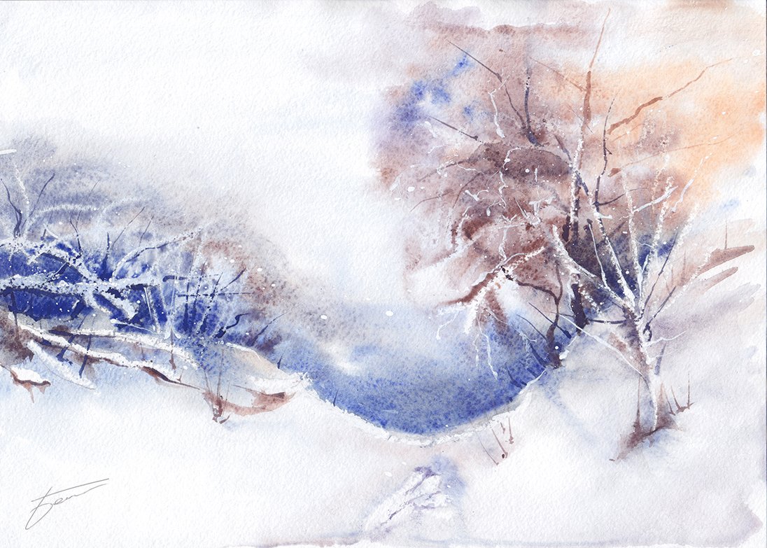 ![Река зимой акварелью]()