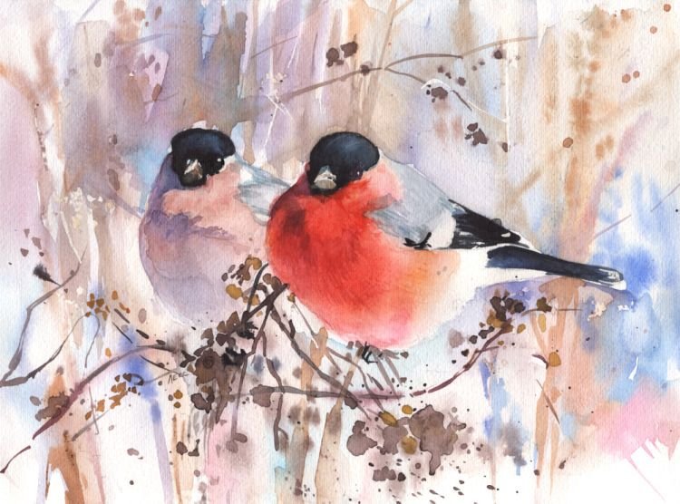 Зимние птицы акварелью
