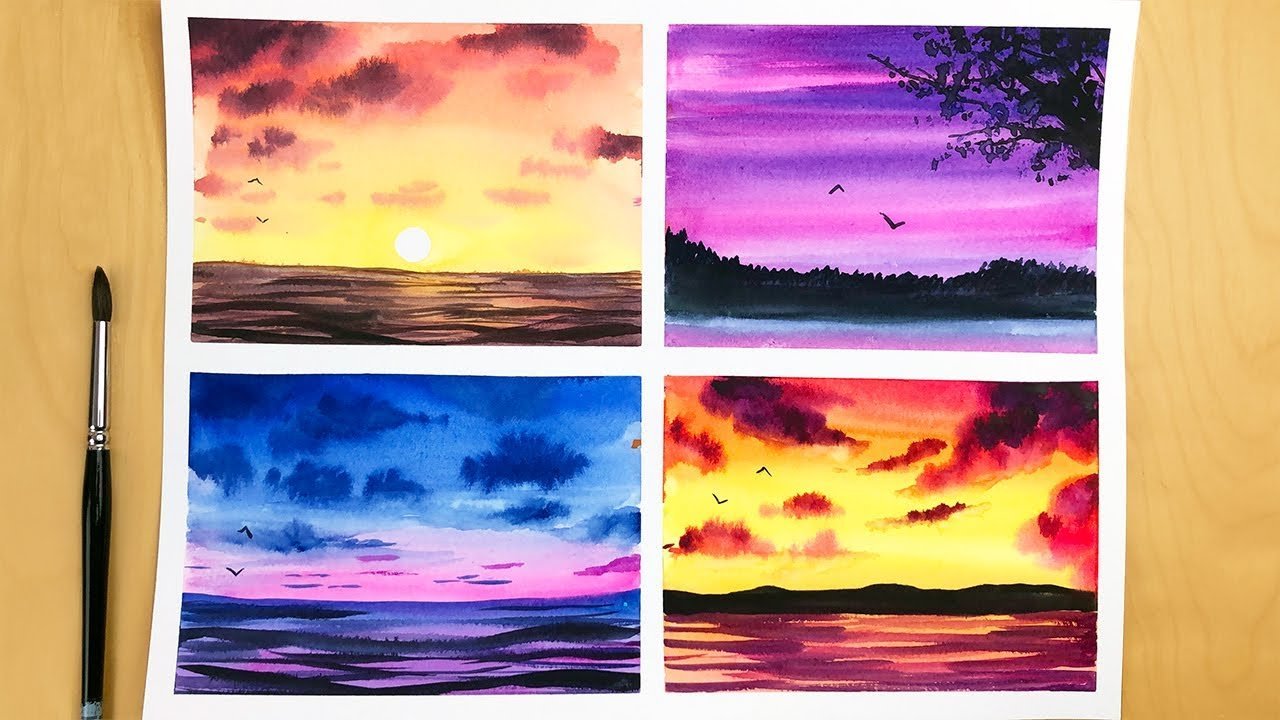 ![Закат акварелью для детей легко]()