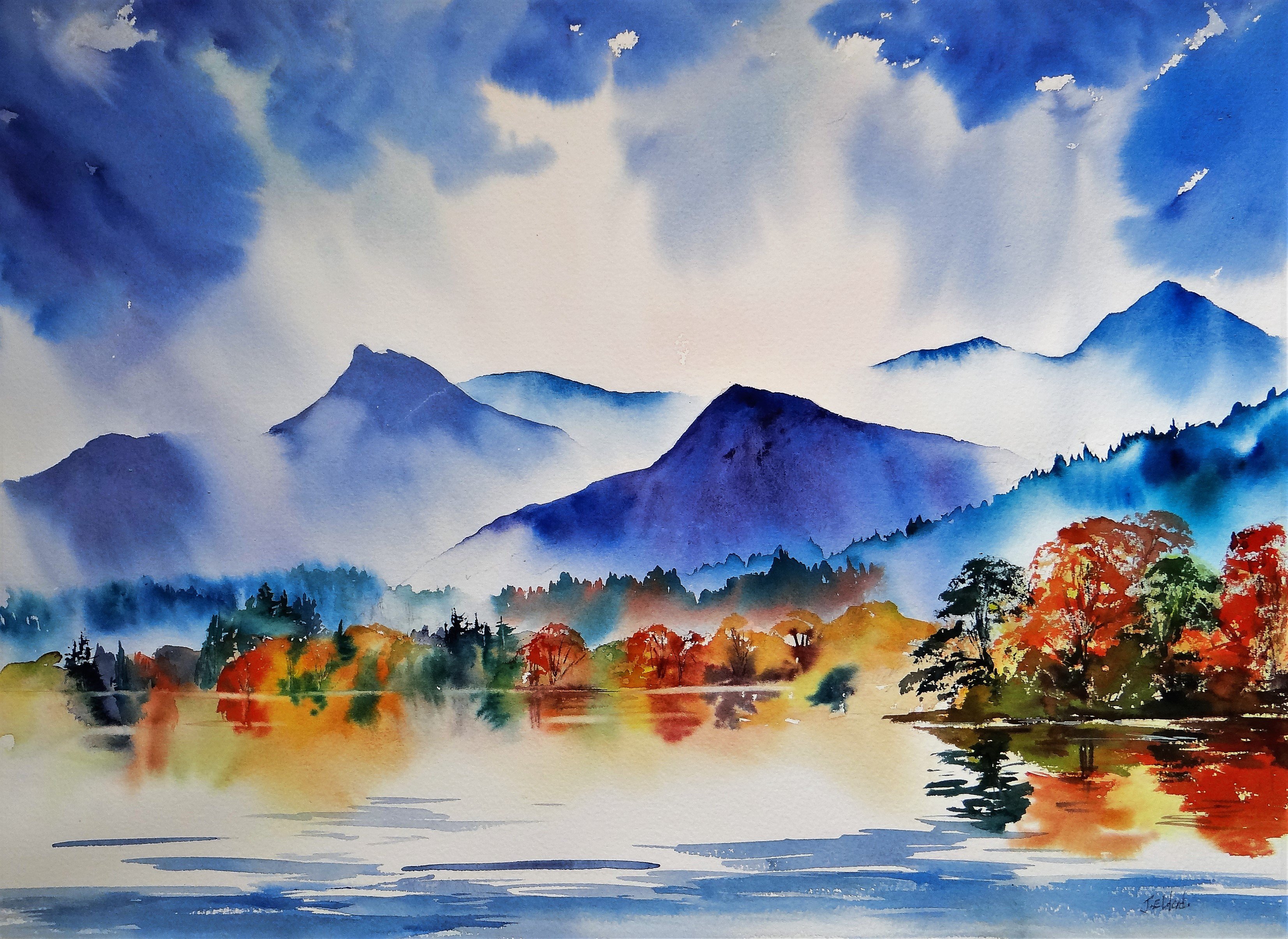 ![Горы и озеро акварель]()