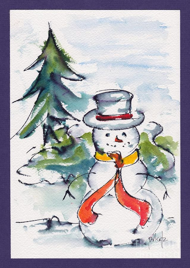 Снеговик рисунок акварелью