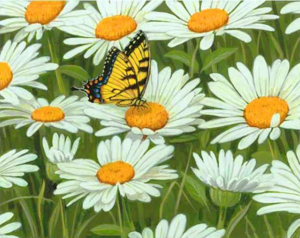 ![Ромашки на поле и бабочки]()