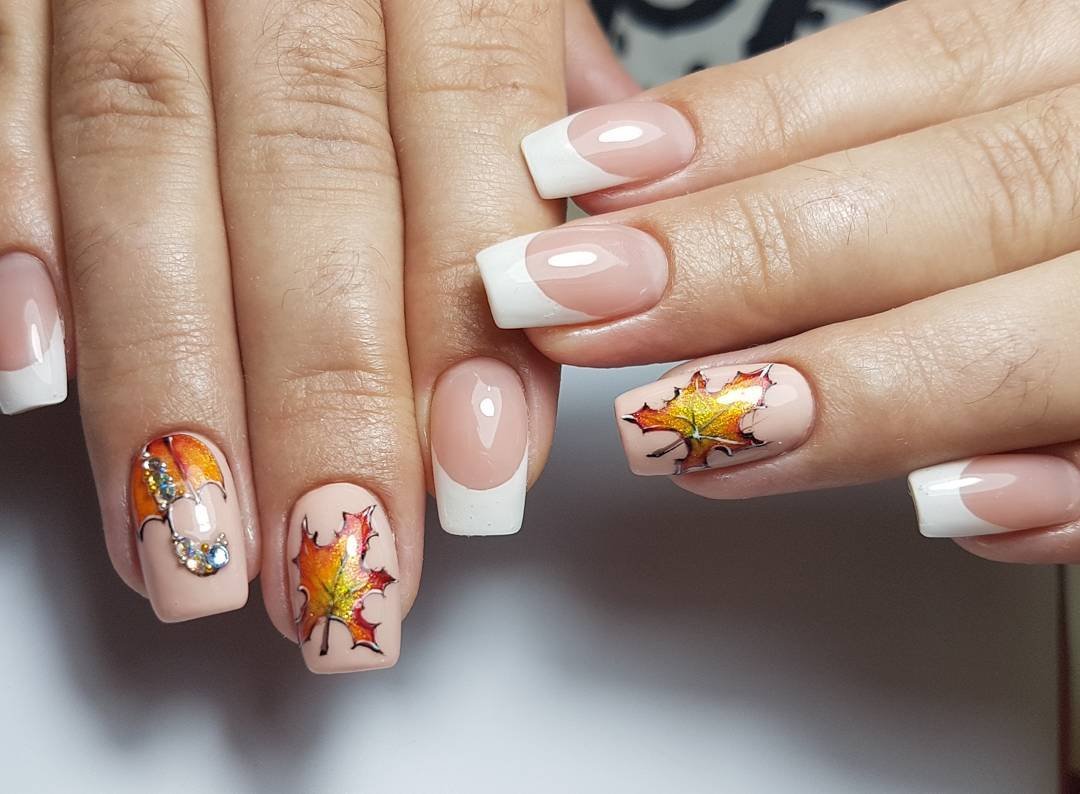 Французский маникюр с кленовым листом