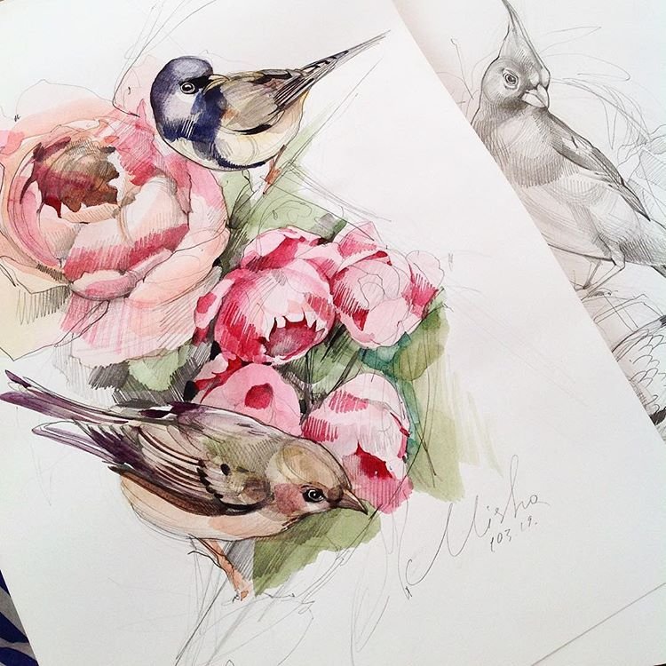 ![Катя Михайлина акварель птицы]()