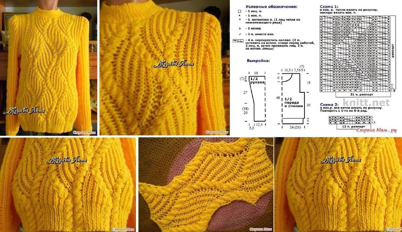 ![Джемпер с горловины вязание спицами ажурным узором]()