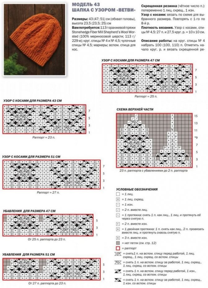 ![Узоры для шапок спицами со схемами]()