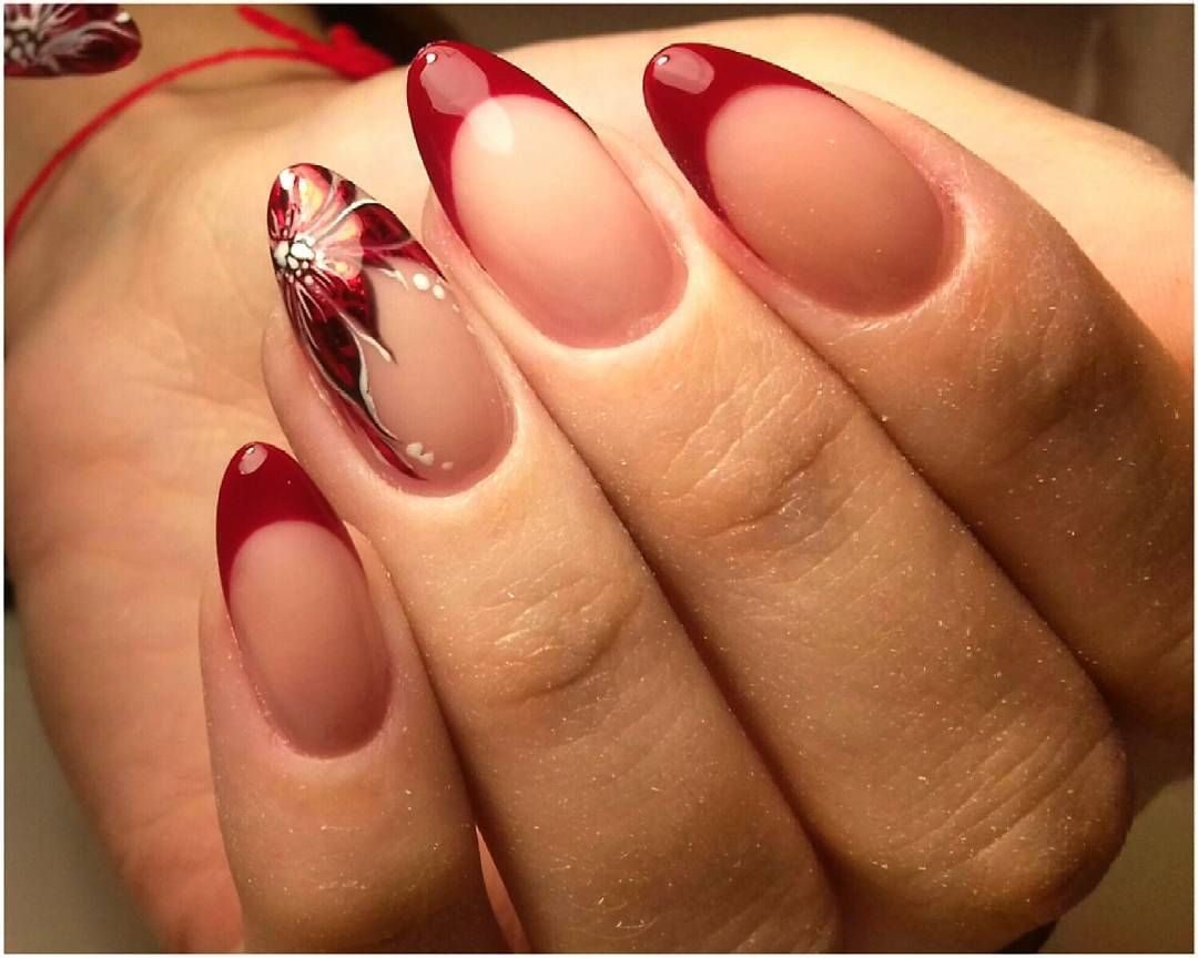 ![Красный френч на миндалевидных ногтях с рисунком]()