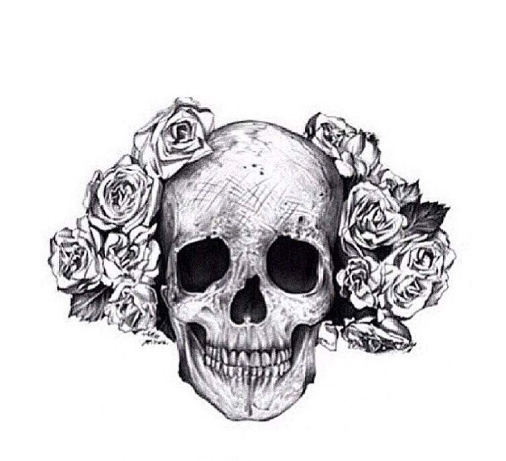 ![Рисунки карандашом черепа с розами]()