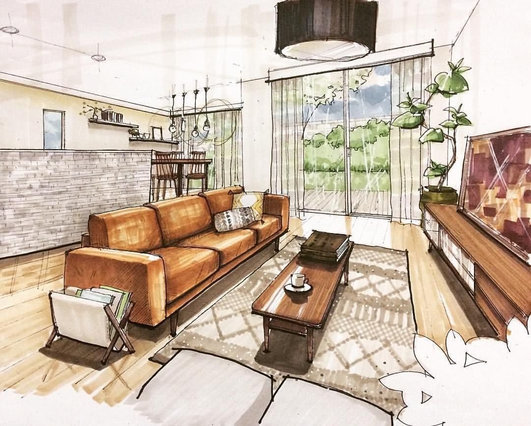 ![Интерьер гостиной скетч]()
