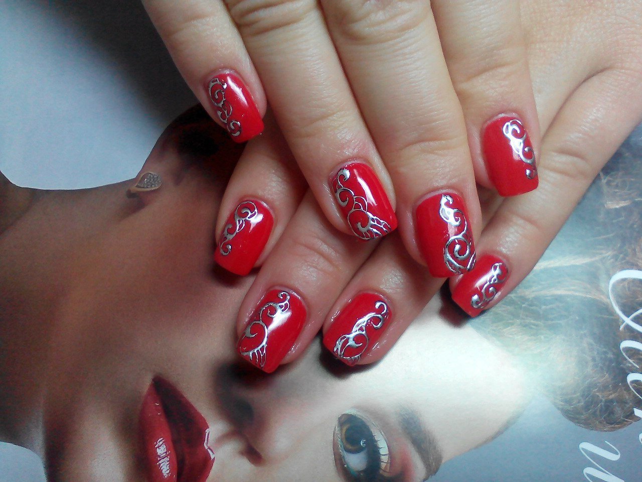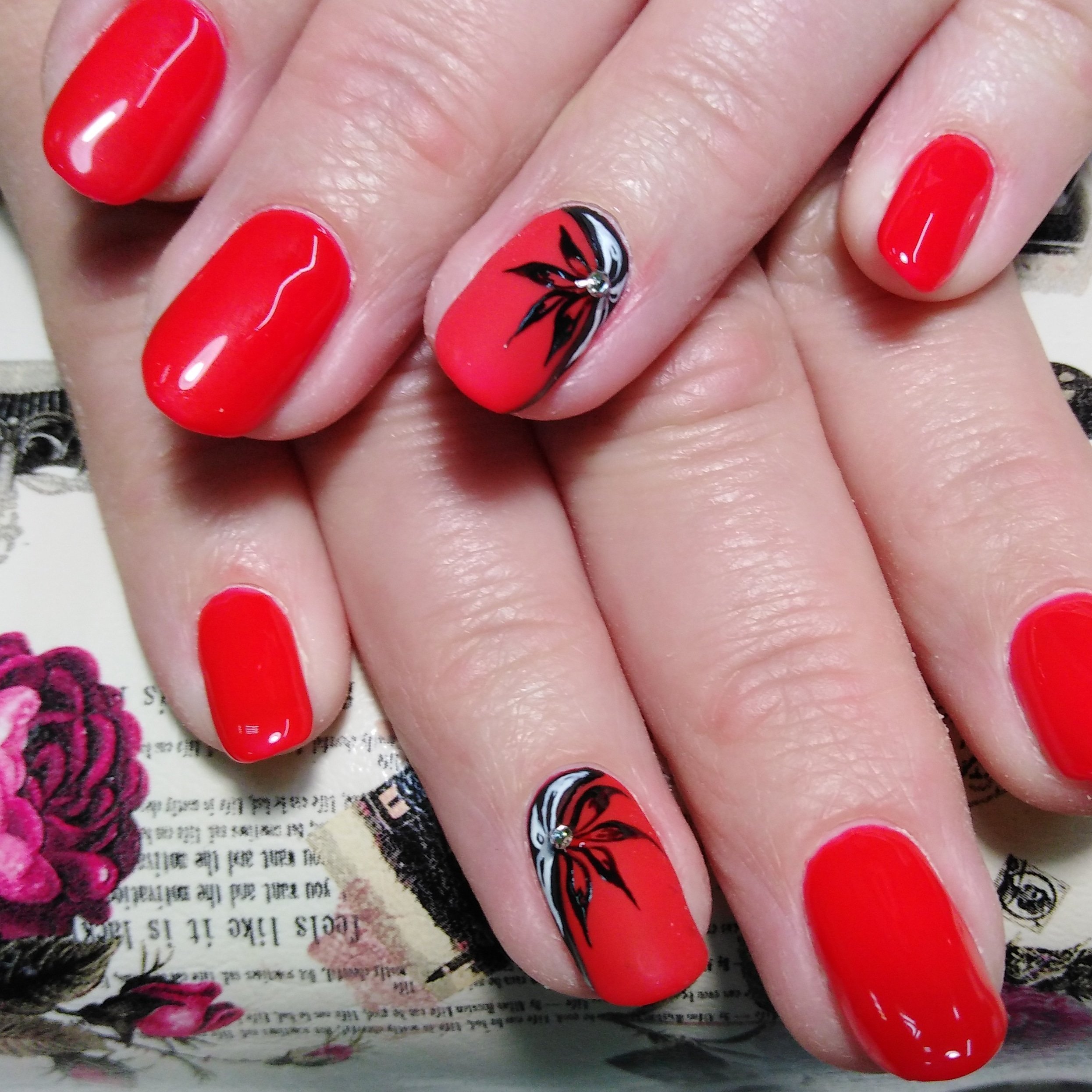 Ногти с красным лаком и рисунком