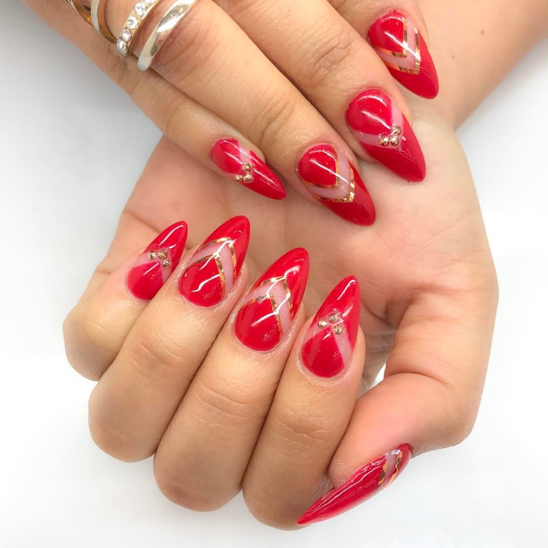 Красный маникюр с сердечками