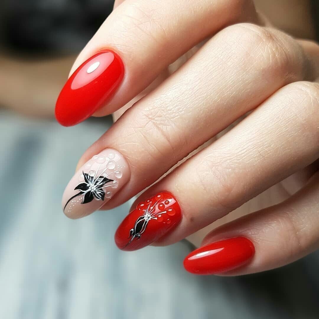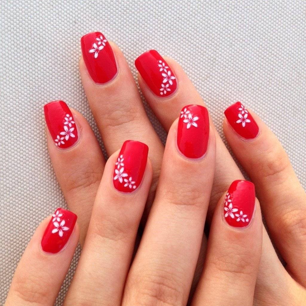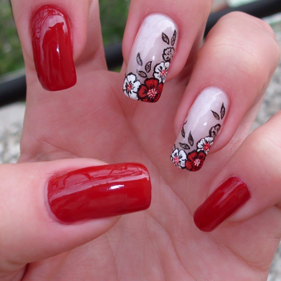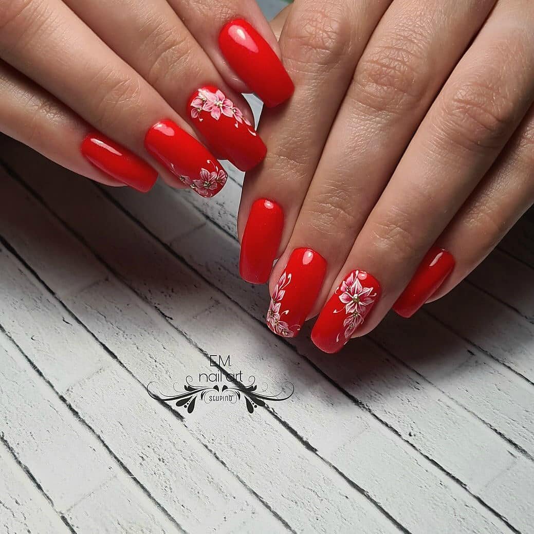 Красный маникюр с цветами