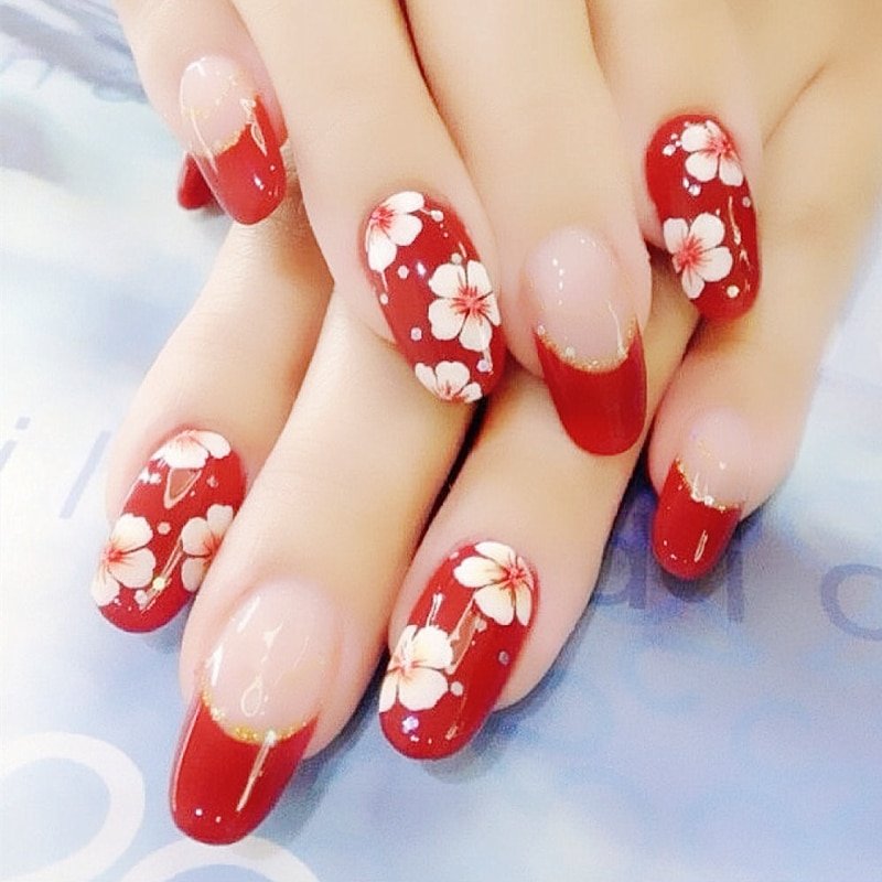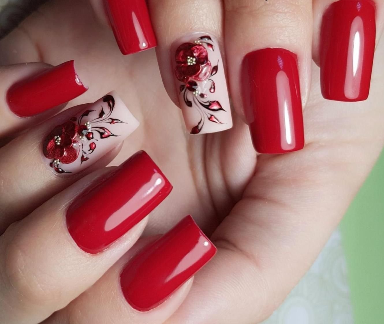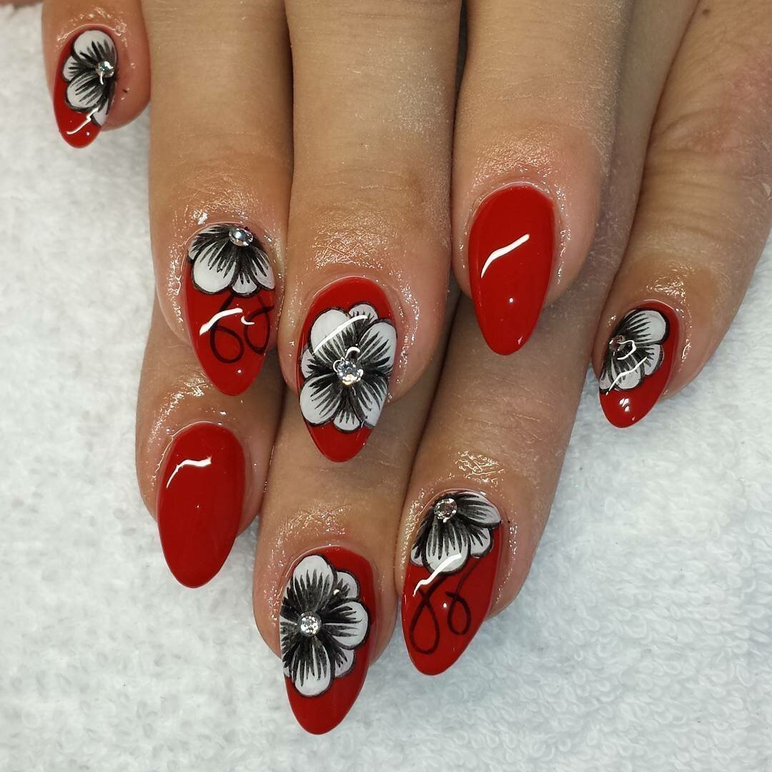 Красный маникюр с цветами