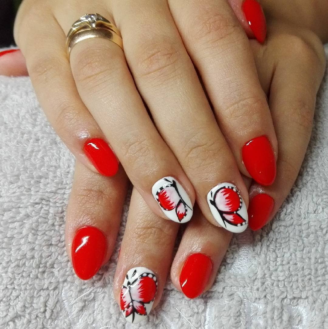 Красный маникюр с бабочкой