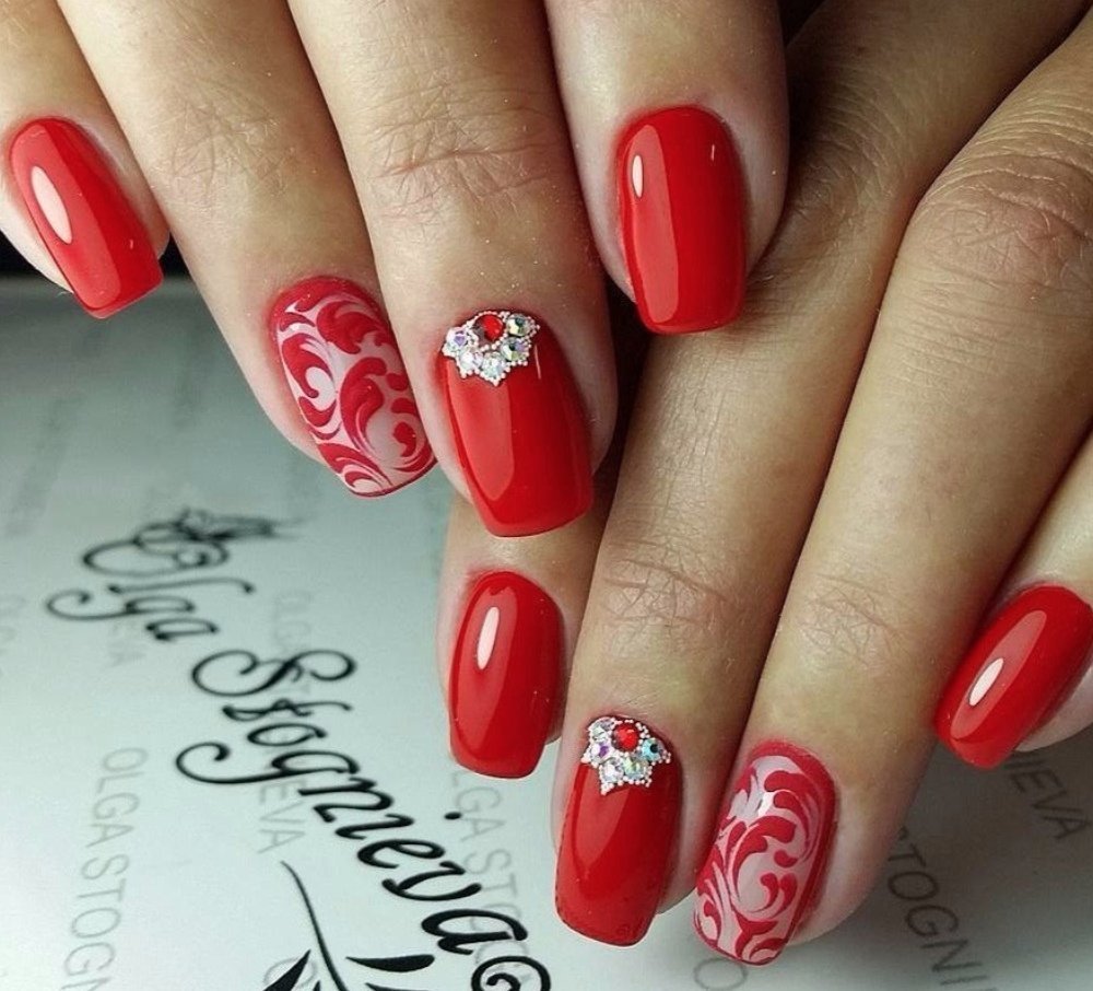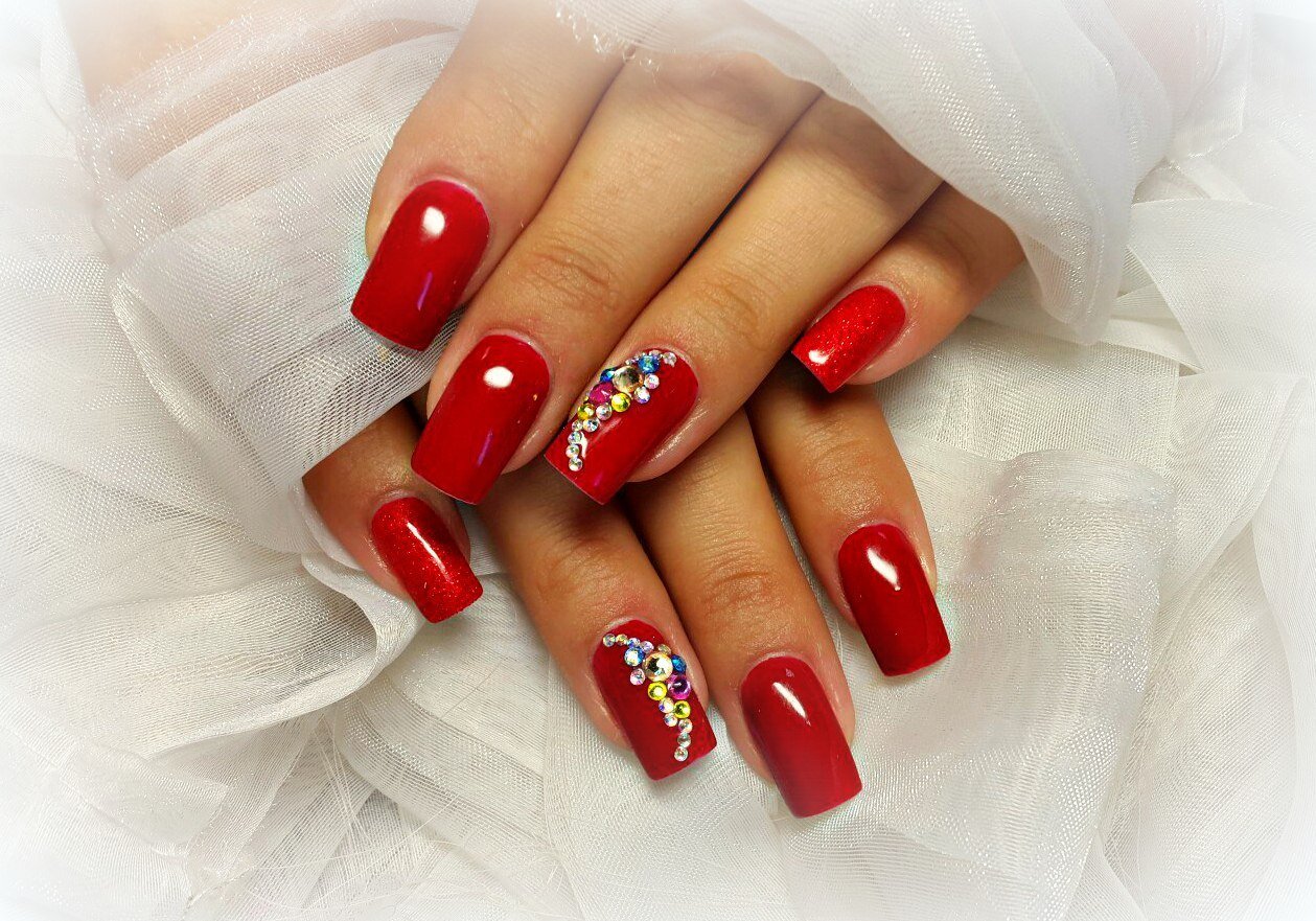 Красный маникюр с красными стразами