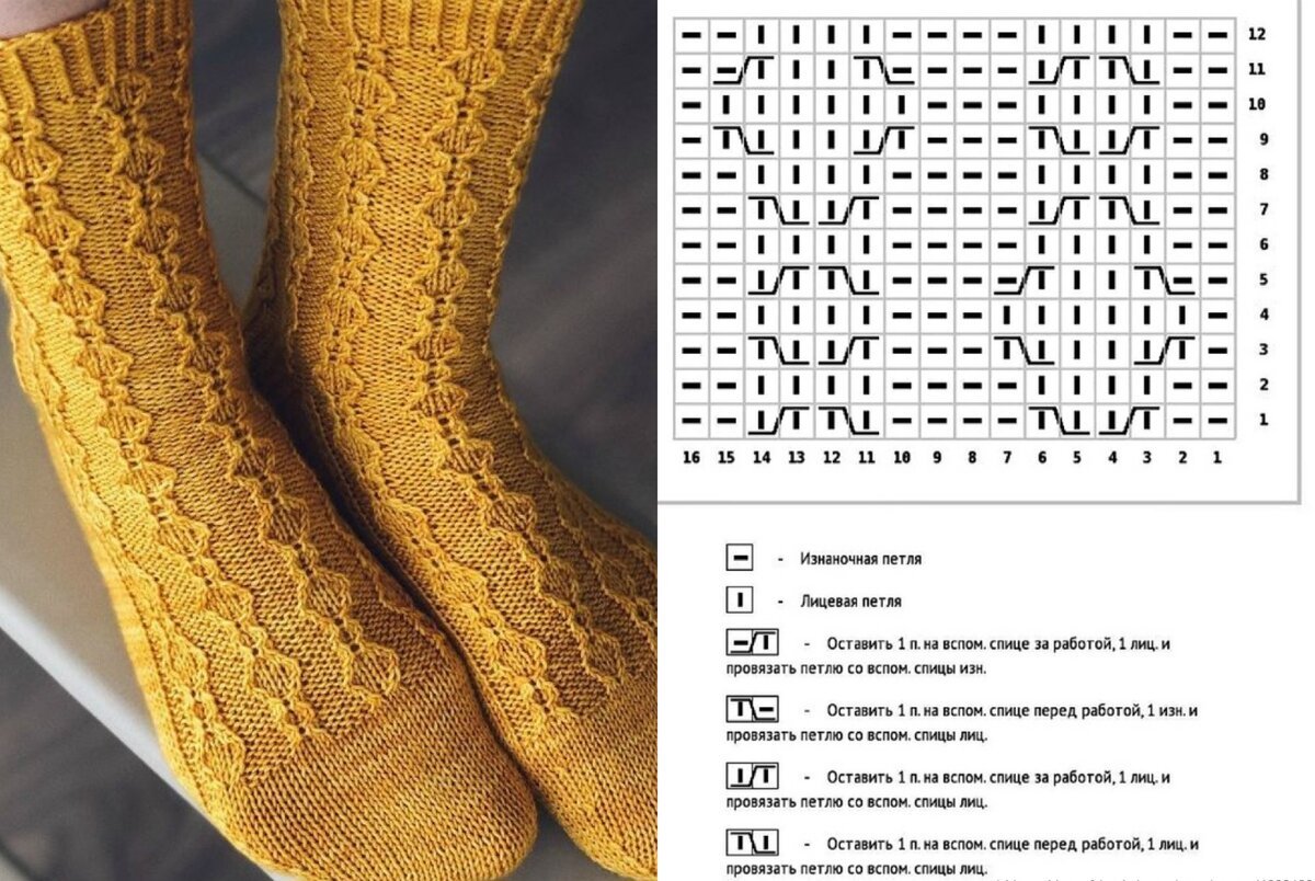 ![Узоры спицами для носков с описанием и схемами на 5 спицах]()