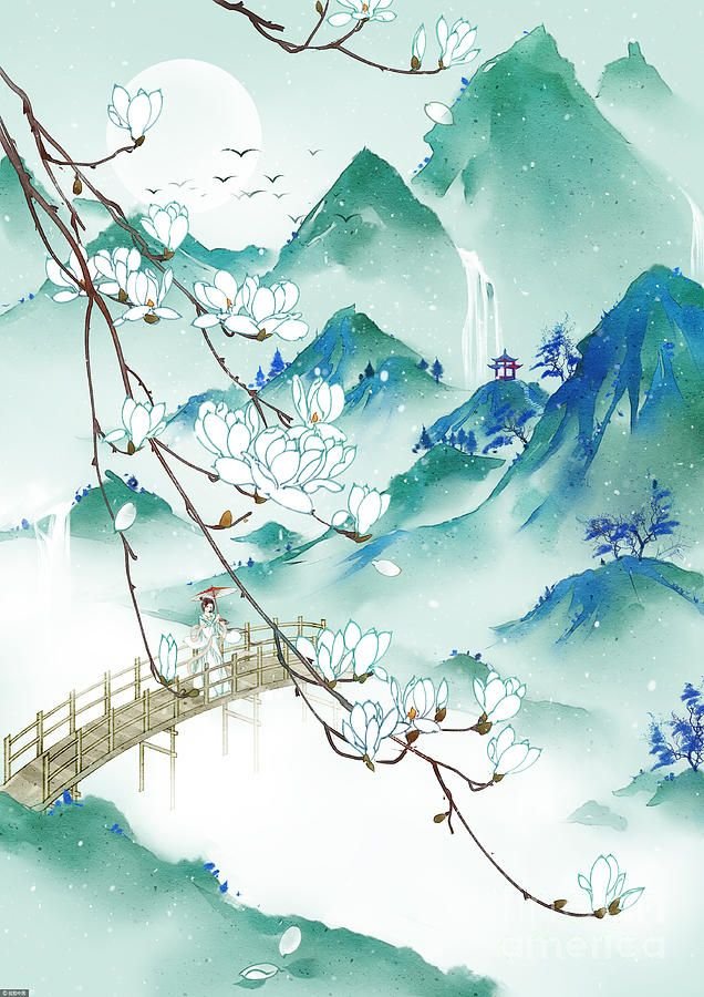 ![Пейзаж в японском стиле на белом фоне]()