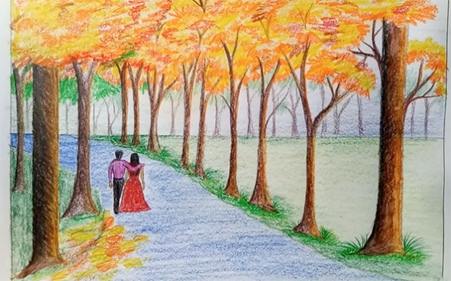 ![Осенний пейзаж цветными карандашами]()