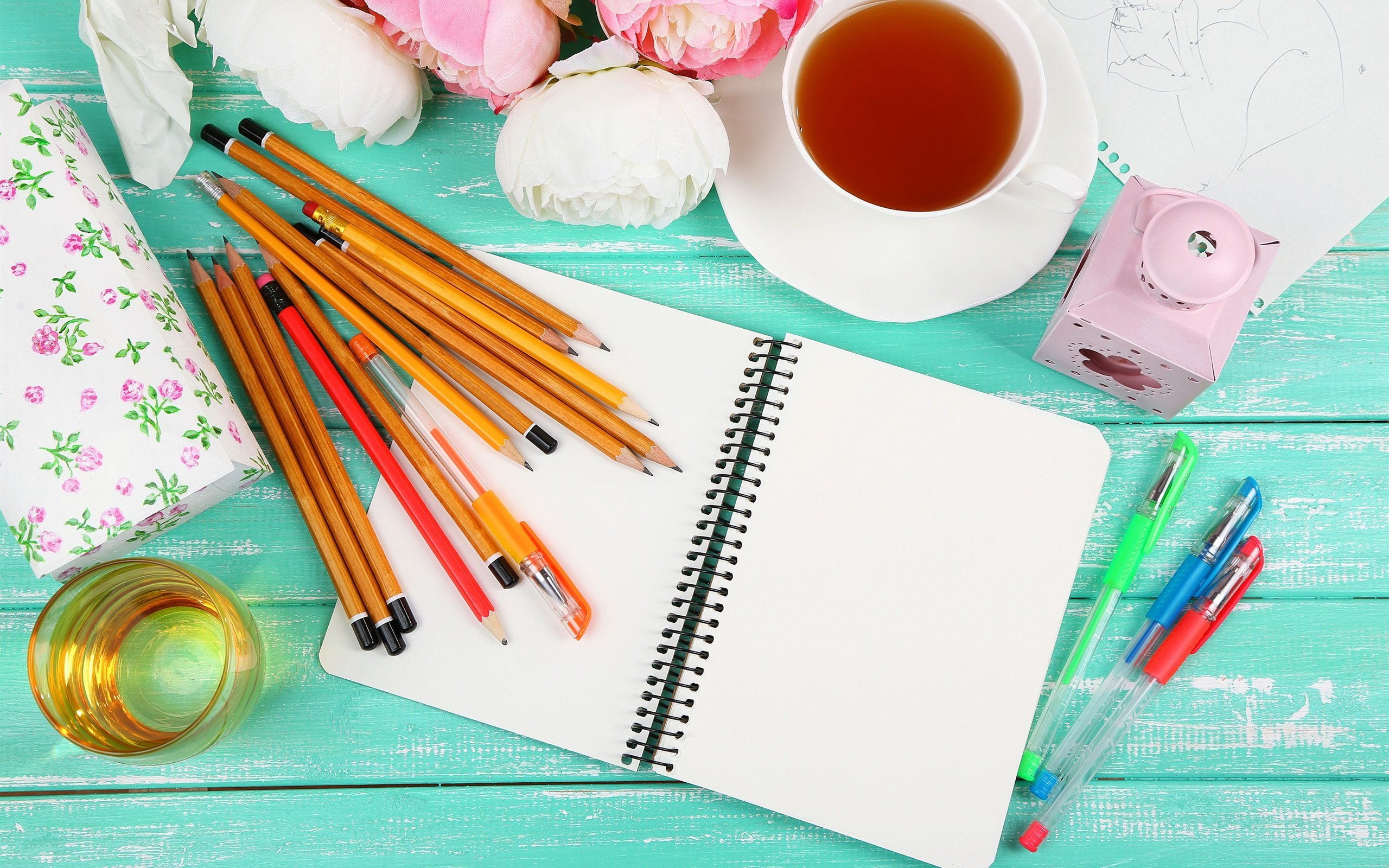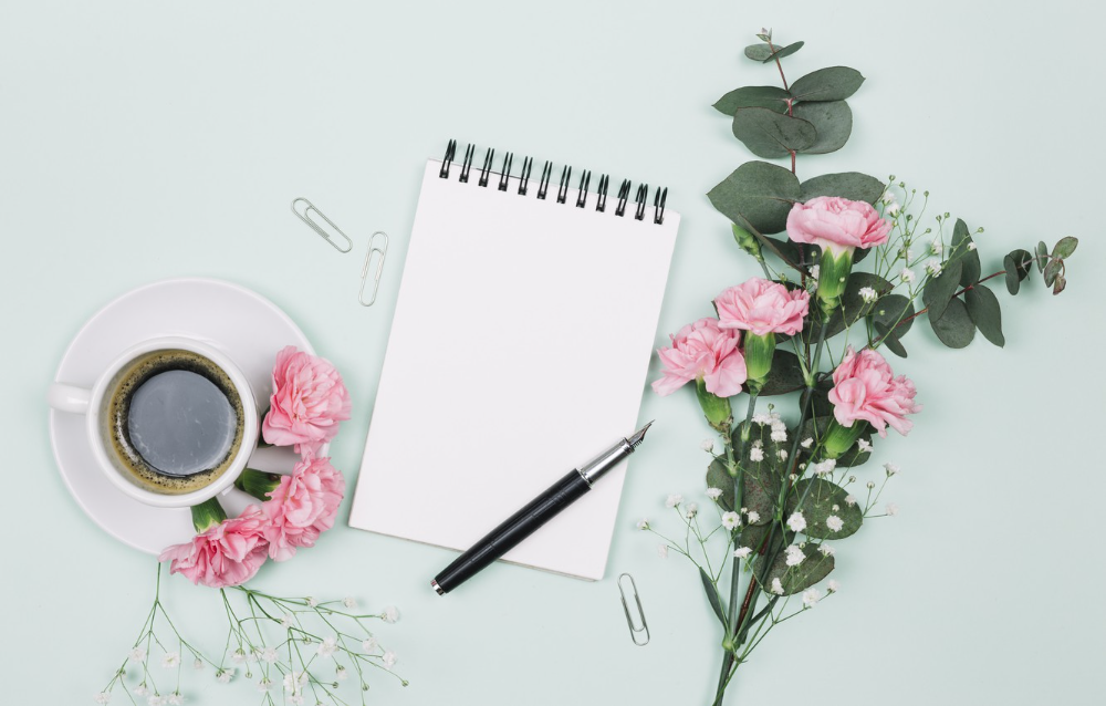 ![Цветы и блокнот на столе]()