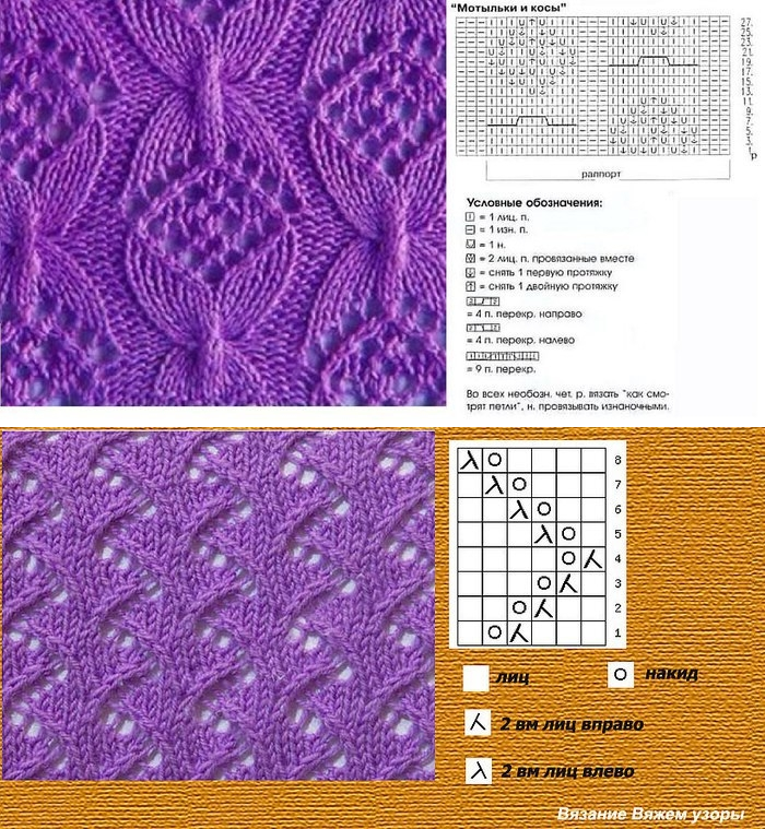 ![Образцы ажурного вязания на спицах со схемами]()