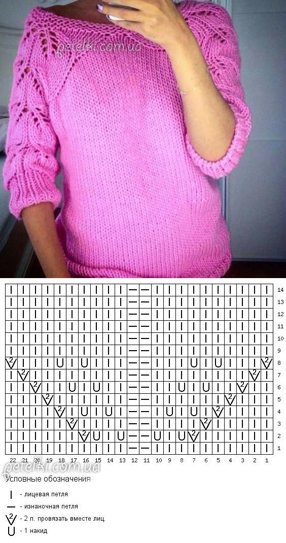 Узор листики спицами схема реглан