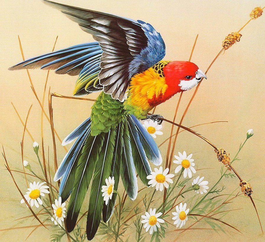 ![Живопись птицы с яркими цветами]()