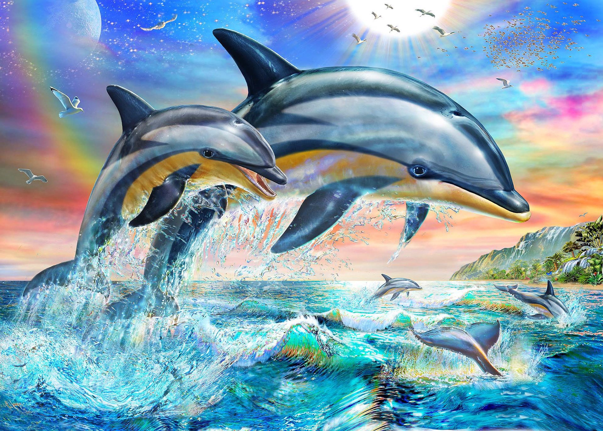 ![Красивые морские пейзажи с дельфинами]()