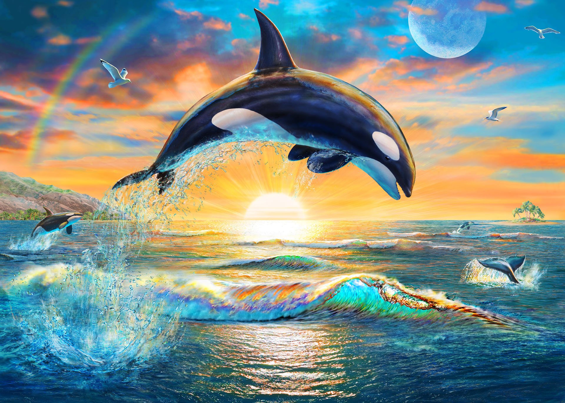 ![Морской пейзаж с дельфинами]()