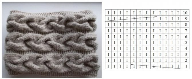 ![Схема узора косы для снуда спицами]()