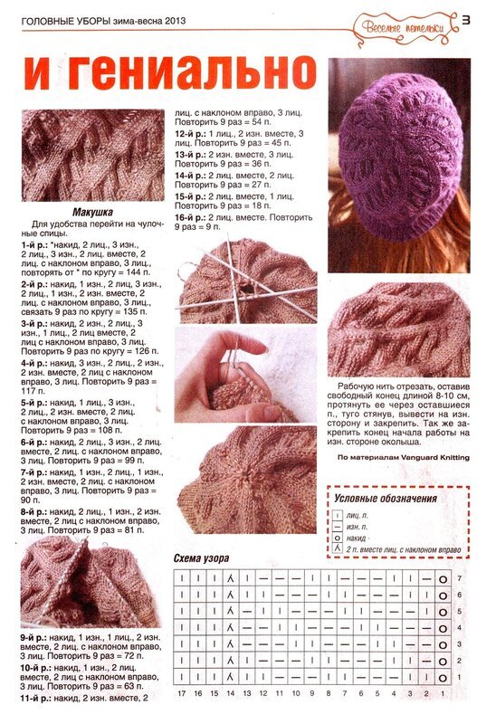 ![Рельефные узоры вязания шапок спицами со схемами]()